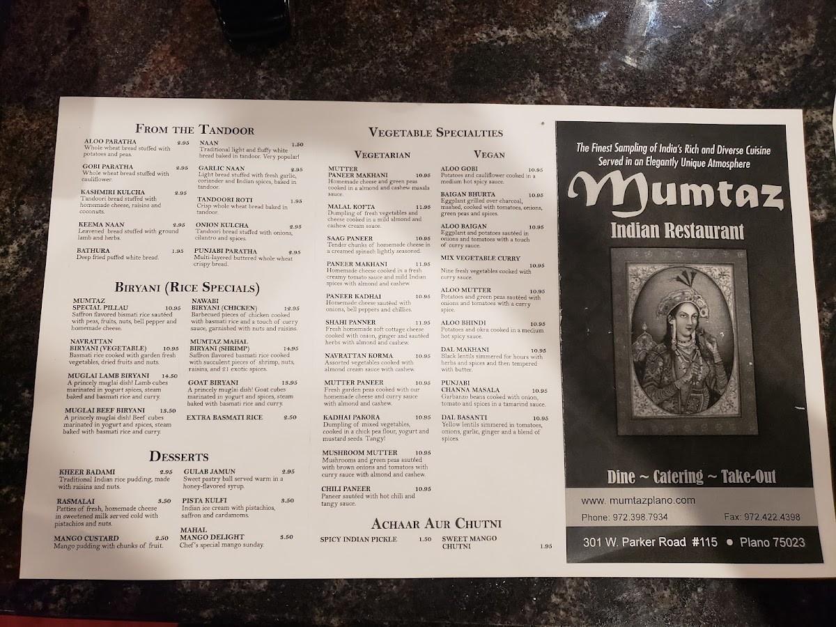 Food reviewers rave about the flavor and generous portion sizes, noting that dishes like the Paneer Makhani and Samosas strike a balance of authenticity and taste. With a warm and welcoming atmosphere, Mumtaz is not just a restaurant; it's a culinary experience that brings the heart of India to Texas. Highly recommended for anyone seeking delicious Indian fare!